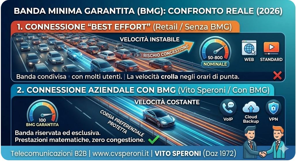 Il consiglio dell’esperto (Vito Speroni): “In 50 anni di telecomunicazioni ho imparato che una linea da 100 Mbps con il 100% di BMG è infinitamente più preziosa per un’azienda rispetto a una linea da 1 Gbps ‘best effort’ senza garanzie. La velocità serve a impressionare, la stabilità serve a lavorare.”