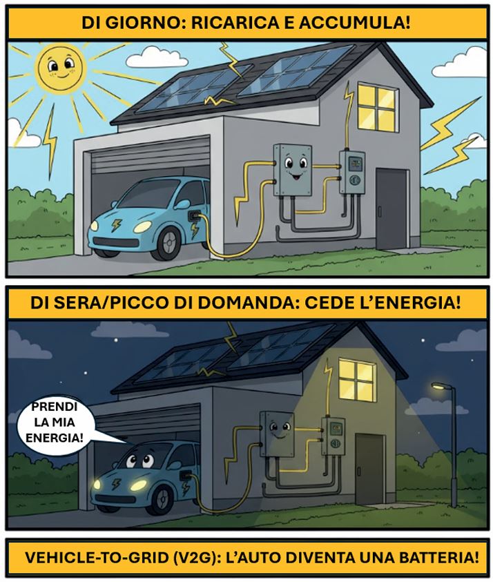 - Giorno: L’auto è parcheggiata e assorbe tutta l’energia in eccesso prodotta dai pannelli (energia a costo zero).