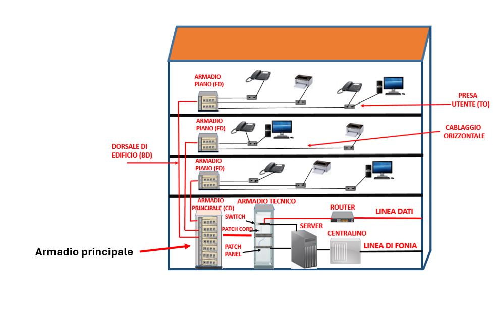 verso il distributore di edificio (BD), ecc. Ogni ramo del cablaggio termina su un’apparecchiatura attiva (es. Armadio Tecnico) che realizza il collegamento in rete degli utenti stessi.
