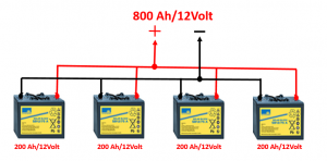 - La Capacità Delle Batterie in Ah da collegare all’impianto Fotovoltaico è l’energia necessaria per un accumulo di 6 giorni, e inoltre tiene conto della scarica all’80% (batterie al Litio).Per avere gli Ah necessari le batterie possono essere collegate in parallelo e la Tensione è costante e la Corrente di somma, se sono collegate in serie la Corrente rimane costante e le Tensioni si sommano (es. se devo avere disponibili 800 Ah posso utilizzare 4 batterie da 200 Ah collegate in parallelo).
