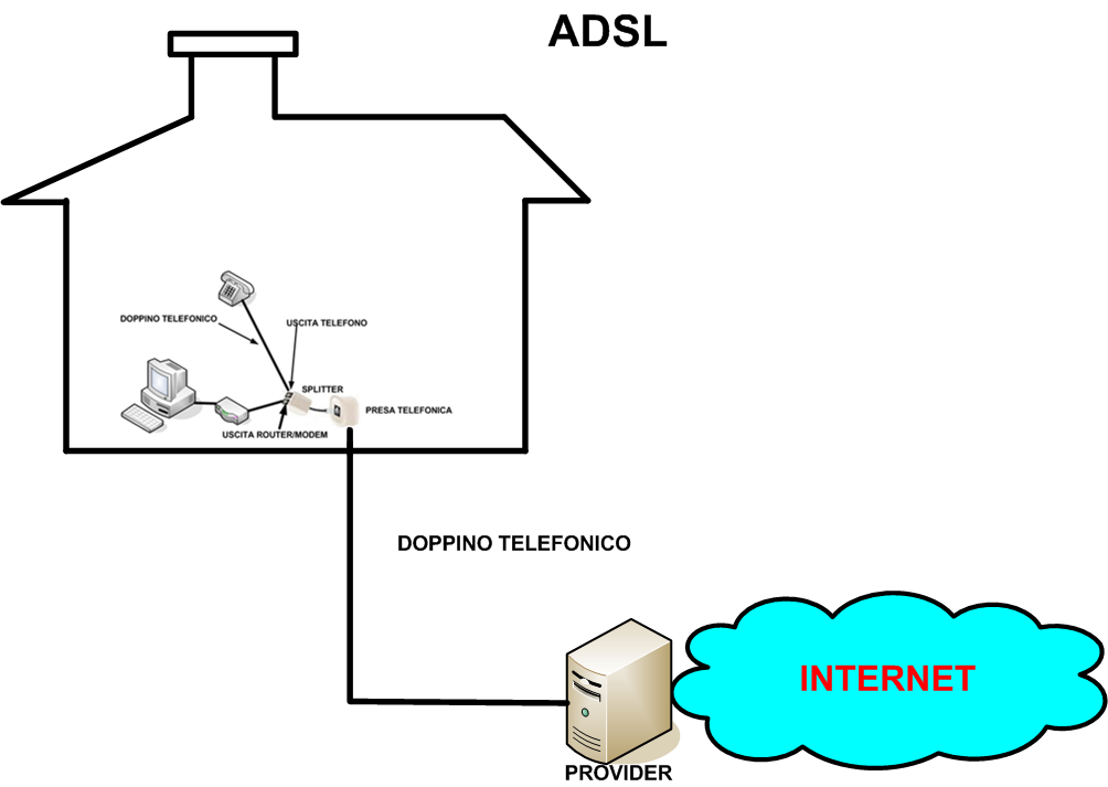 Perciò la linea telefonica sarà collegata all’ingresso dello Splitter(Filtro), mentre una delle uscite sarà collegata al telefono e l’altra uscita al Modem ADSL.