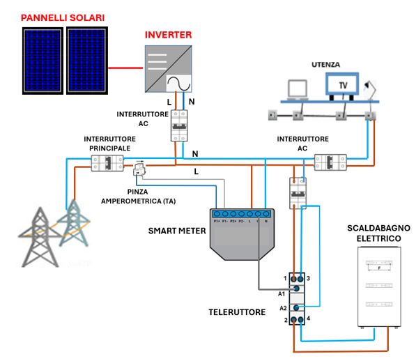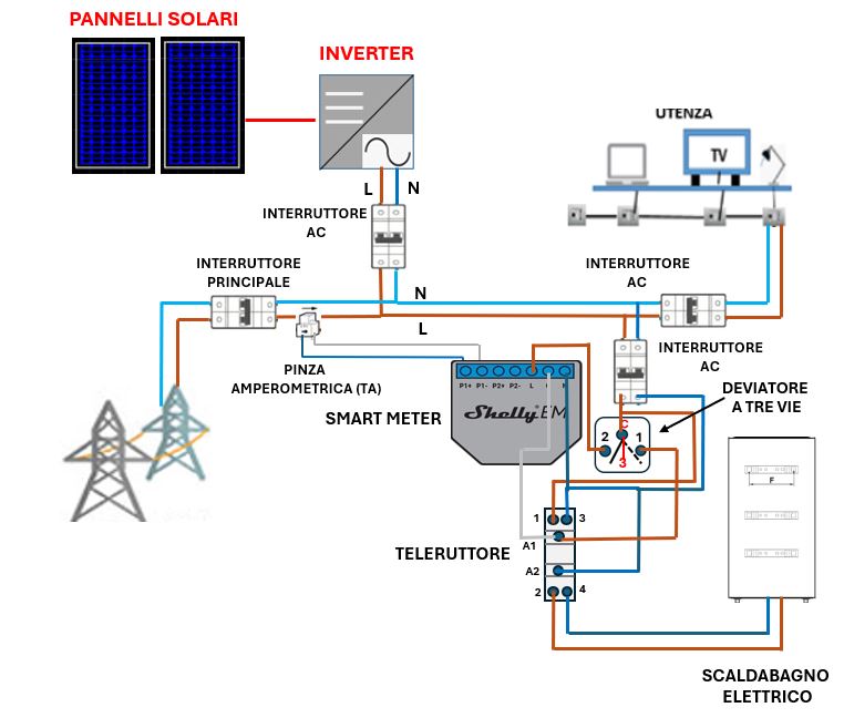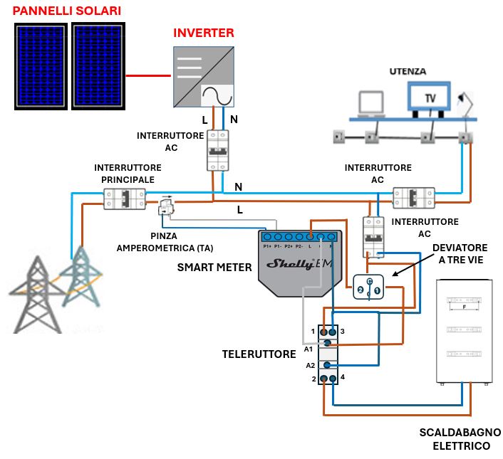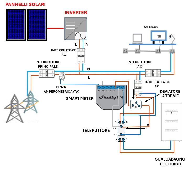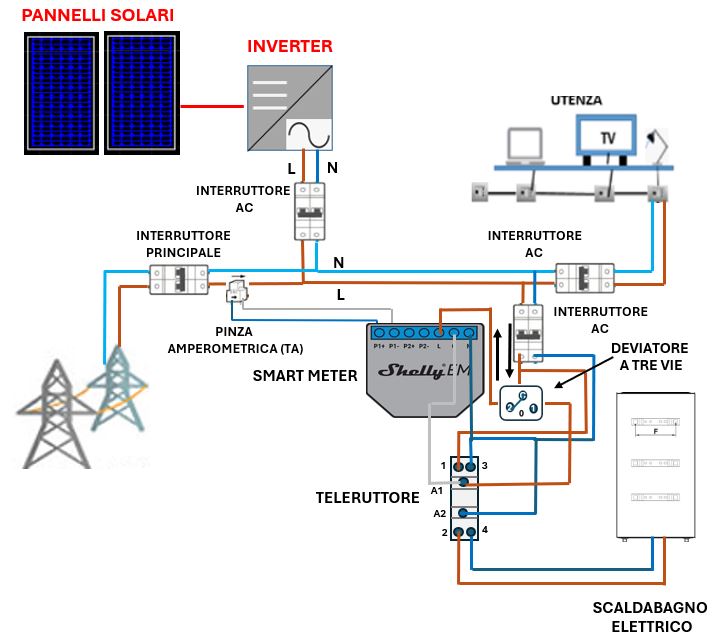 Lo smart meter, come ad esempio il Shelly EM, è un dispositivo elettronico progettato per gestire correnti di piccola entità. Tuttavia, nel caso in cui lo si utilizzi per alimentare uno scaldabagno sfruttando l’energia in eccesso prodotta da un impianto fotovoltaico, la potenza richiesta generalmente rientrerebbe tra i 1500 e i 2400 Watt. Per evitare danni ai contatti del relè dello smart meter, che potrebbero surriscaldarsi o deteriorarsi sotto carichi così elevati, è necessario integrare un teleruttore.