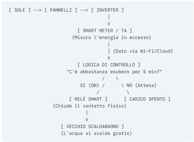 SCHEMA TECNICO E LOGICO SU COME ATTIVARE LO SCALDABAGNO O ALTRI APPARATI QUANDO ESISTE UN SURPLUS DI ENERGIA FOTOVOLTAICA