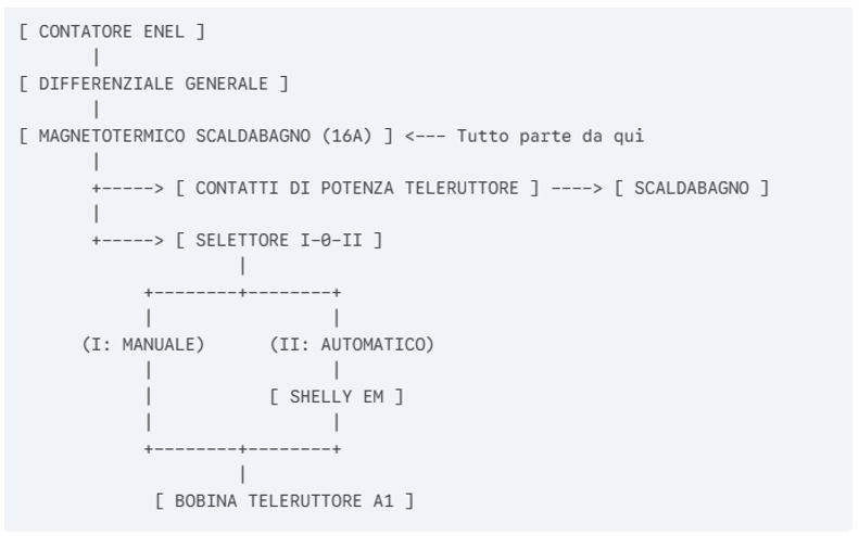 - Manutenzione: Se devi lavorare sul sistema (o sostituire lo Shelly), abbassi il magnetotermico e sei certo che non arrivi tensione né al selettore né allo scaldabagno.