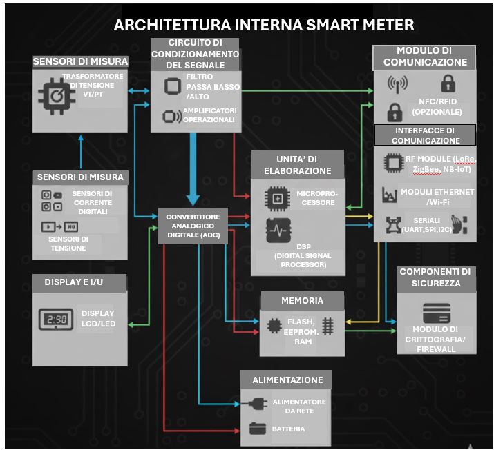 Ecco uno schema dettagliato con i componenti specifici di uno smart meter (contatore intelligente):