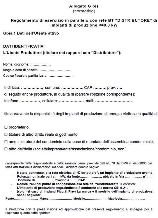 L‘impianto fotovoltaico Plug & Play, che significa collega e utilizza, è un sistema progettato per essere facilmente installato su balconi, terrazzi, giardini e spazi simili. Viene fornito preassemblato e pronto per l’installazione, rendendo il processo semplice e veloce. Tuttavia, non può essere considerato un impianto in isola, poiché richiede il collegamento alla rete elettrica principale. Per gli impianti con una potenza inferiore a 800 W, è obbligatorio stipulare un accordo con il DSO (Distribution System Operators, ovvero gli Operatori di Sistema di Distribuzione, che gestiscono le reti per la distribuzione dell’energia e ospitano impianti di generazione distribuita). In particolare, si deve sottoscrivere il “Regolamento di esercizio in parallelo con rete BT (Bassa Tensione) del DSO per impianti di produzione ≤ 0,8 kW“, come specificato nell’allegato Gbis .