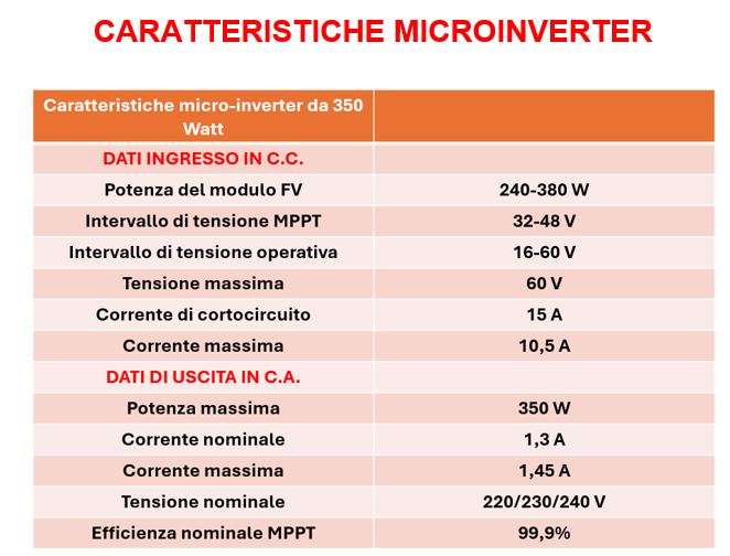 Di conseguenza, se volessi installare un pannello fotovoltaico da 380 Wp, per essere in regola con le normative, dovrei utilizzare un microinverter con una potenza nominale di 350 Watt, che è il valore più basso tra il pannello e l’inverter. È chiaro che la potenza in uscita verso la rete sarà di 350 Watt, poiché il microinverter agirà come un limitatore.