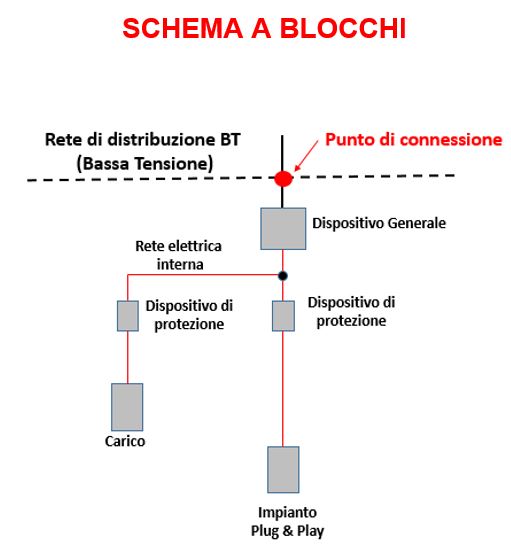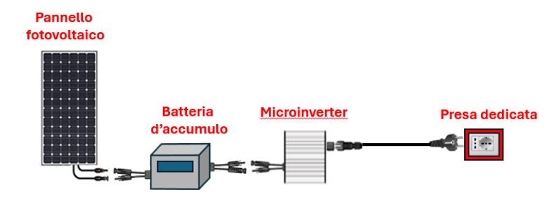 Il sistema di produzione “Plug & Play”, con una potenza nominale massima di 350 W, è costituito solitamente da un pannello fotovoltaico, un microinverter, un cavo elettrico con presa Schuko e una struttura metallica per il fissaggio del pannello. L’impianto viene collegato direttamente a una presa dedicata, facilmente riconoscibile all’interno del sistema elettrico. Questa presa sarà realizzata da un installatore qualificato, utilizzando un circuito specifico che parte dal quadro di distribuzione, dove è presente un interruttore magnetotermico appositamente predisposto.