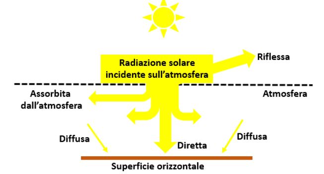 La parte diretta più quella diffusa rappresenta la Radiazione Globale. Se la superficie non è orizzontale ma inclinata si aggiunge anche la radiazione riflessa.