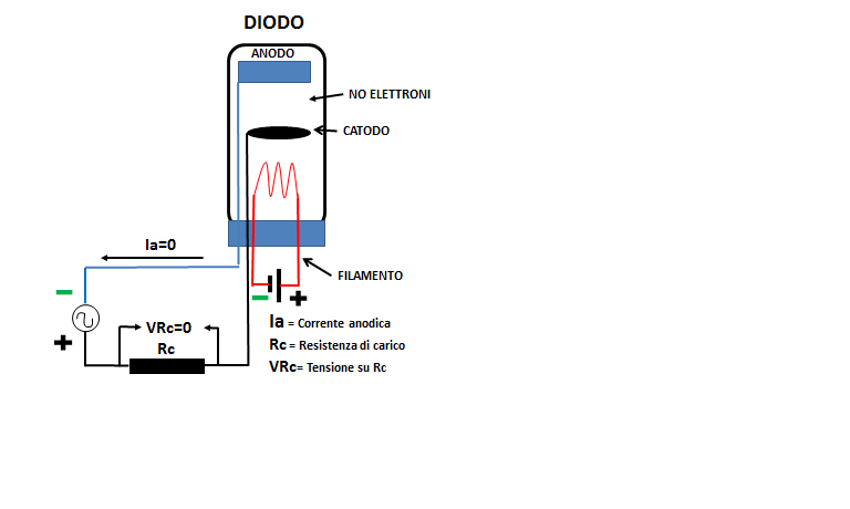 Mentre in corrispondenza della semionda negativa la tensione alternata del diodo non conduce e quindi non ci sarà il passaggio di corrente anodica (Ia) e la tensione ai capi di Rc sarà uguale a 0, in quanto VRc= Rc*Ia ed essendo Ia Corrente anodica uguale a 0 la tensione VRc sarà uguale a 0.