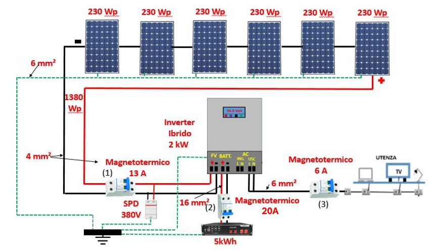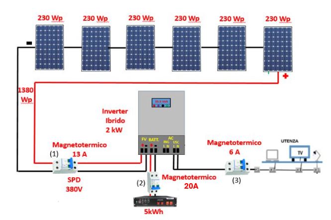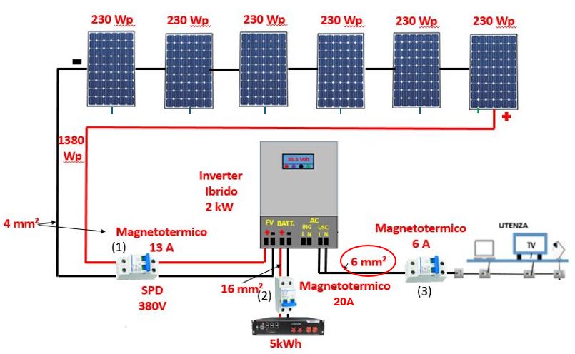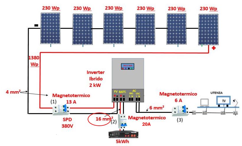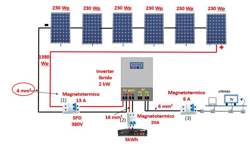 (2) Un magnetotermico in corrente continua tra Inverter e batteria, essendo la corrente massima di 15 A ne metteremo uno da 20A (15*1,25=18,75 A).